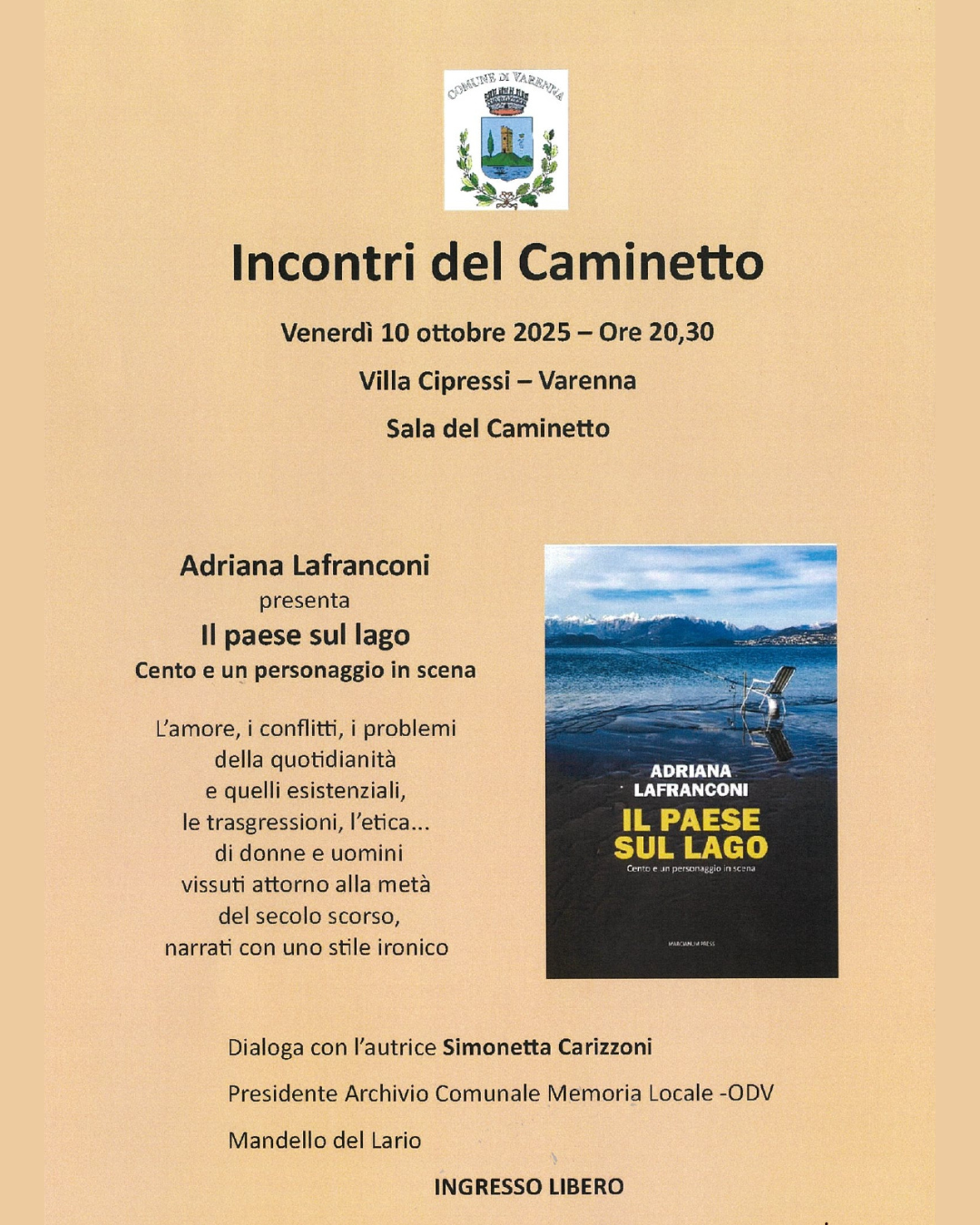 Venerdì 10 ottobre 2025, alle 20:30, Adriana Lafranconi presenta il suo libro Il paese sul lago. Cento e un personaggio in scenapresso la Sala del Caminetto, in Villa Cipressi.